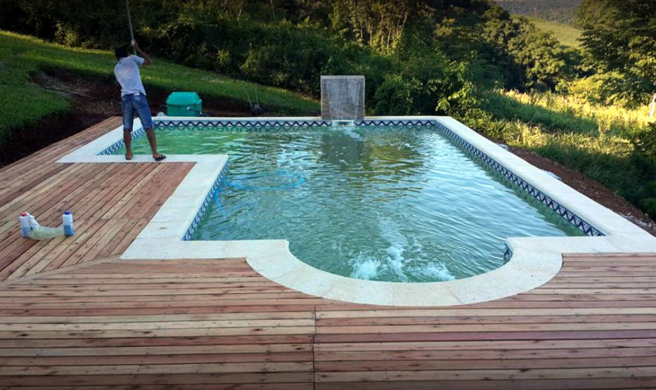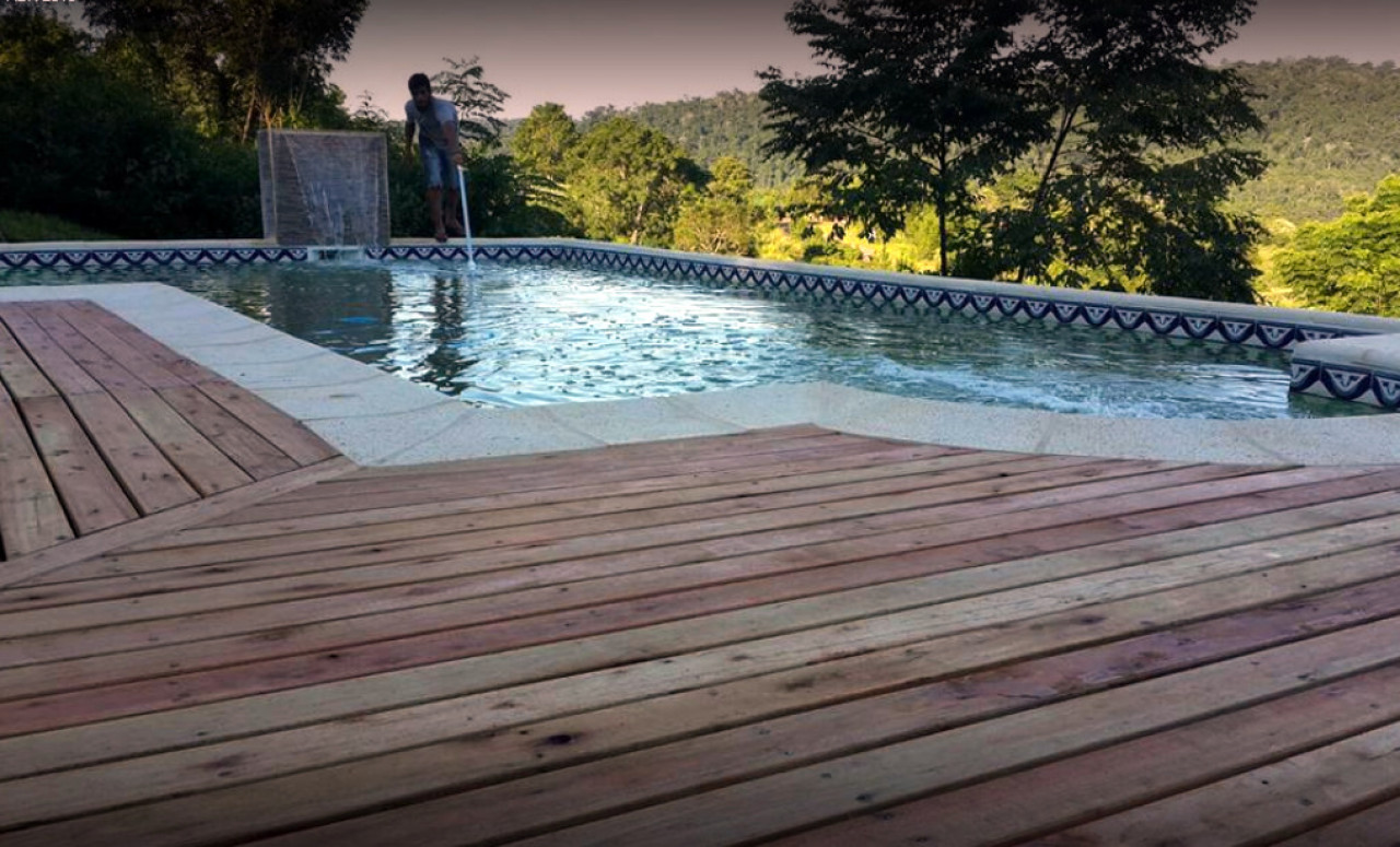 Pileta de 4x8 y 0,80 a 1,60 de profundidad, con solarium de 2x4 y deck, bomba sumergible de 115 mts.