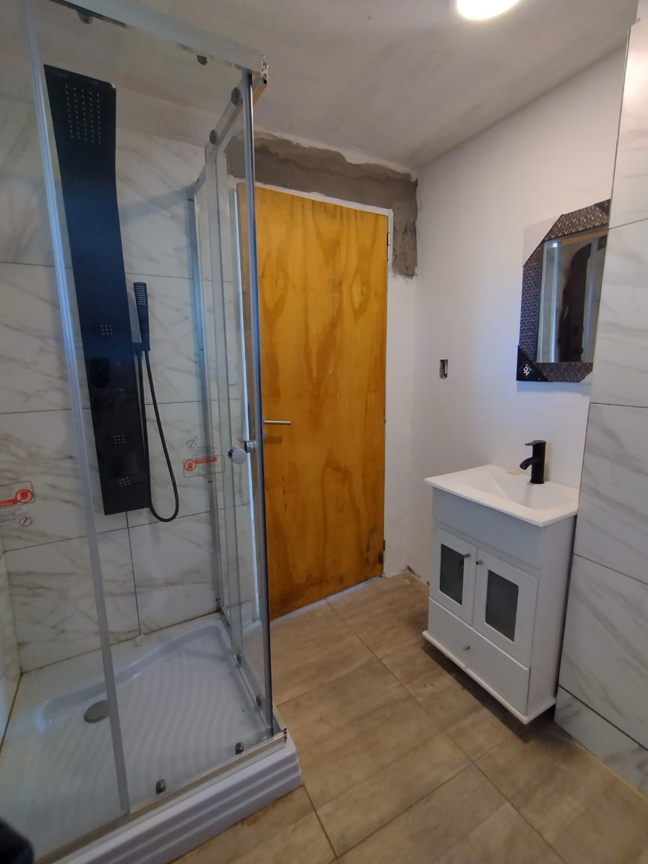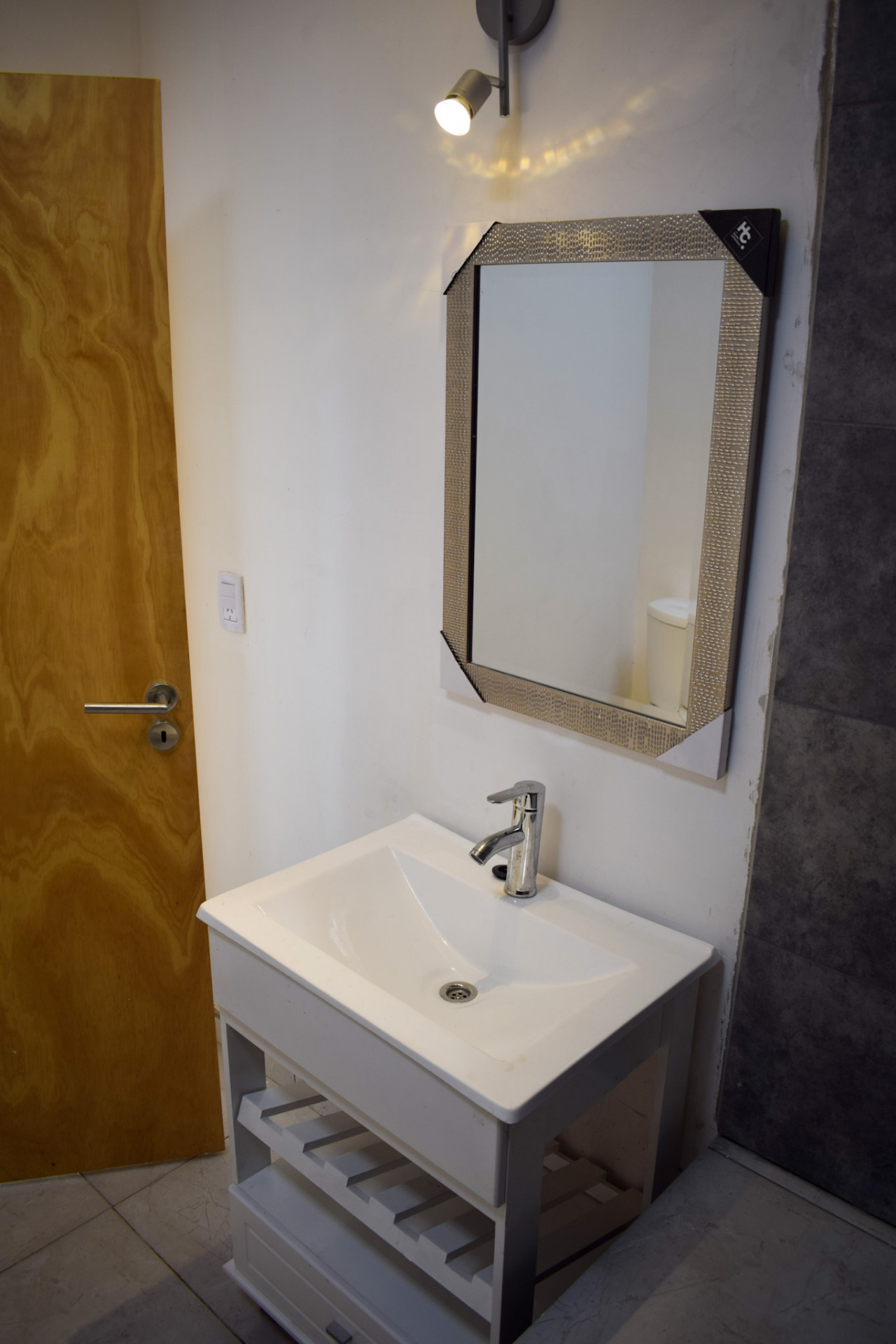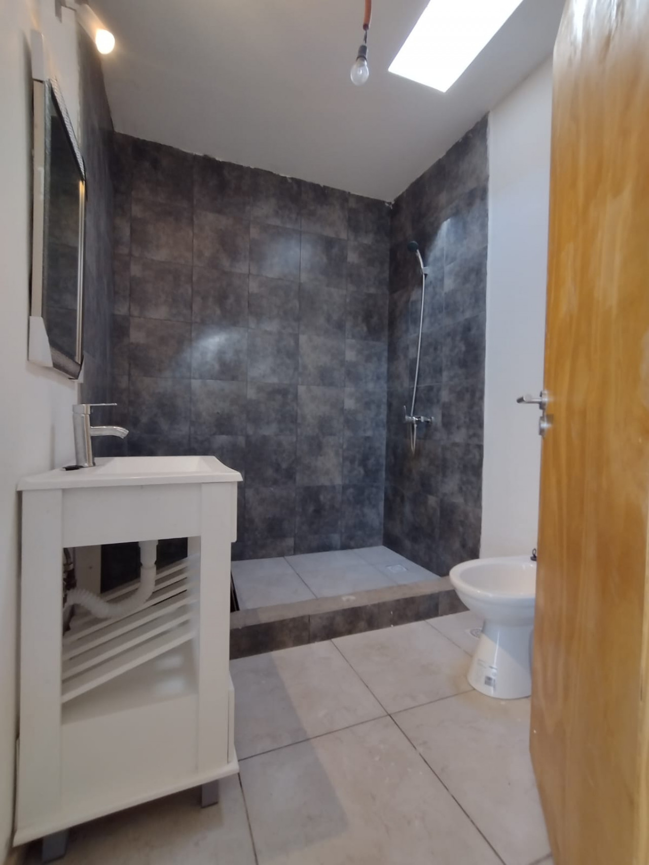 1 baño completo con ducha y mampara de vidrio, vanitory y espejo.