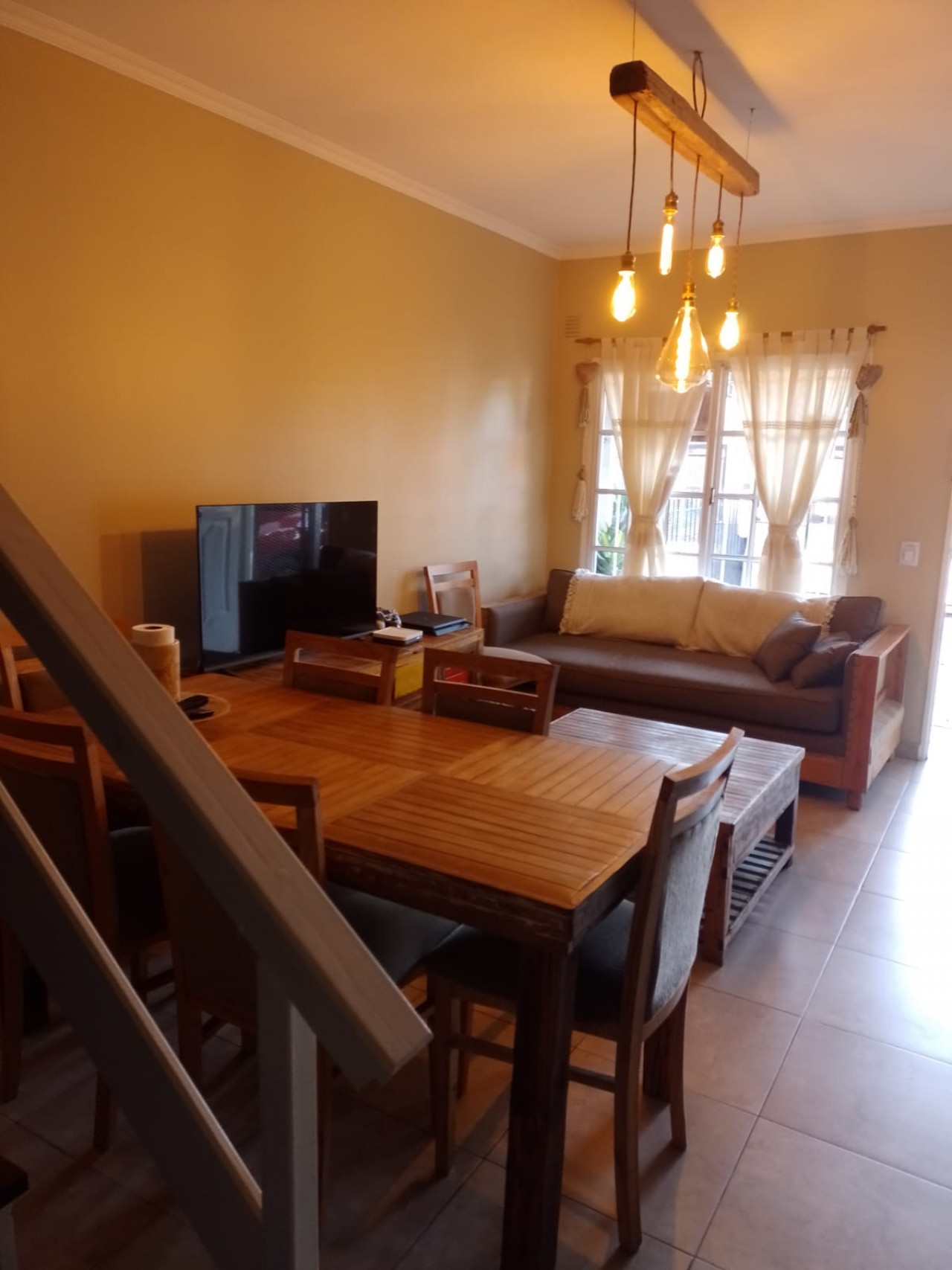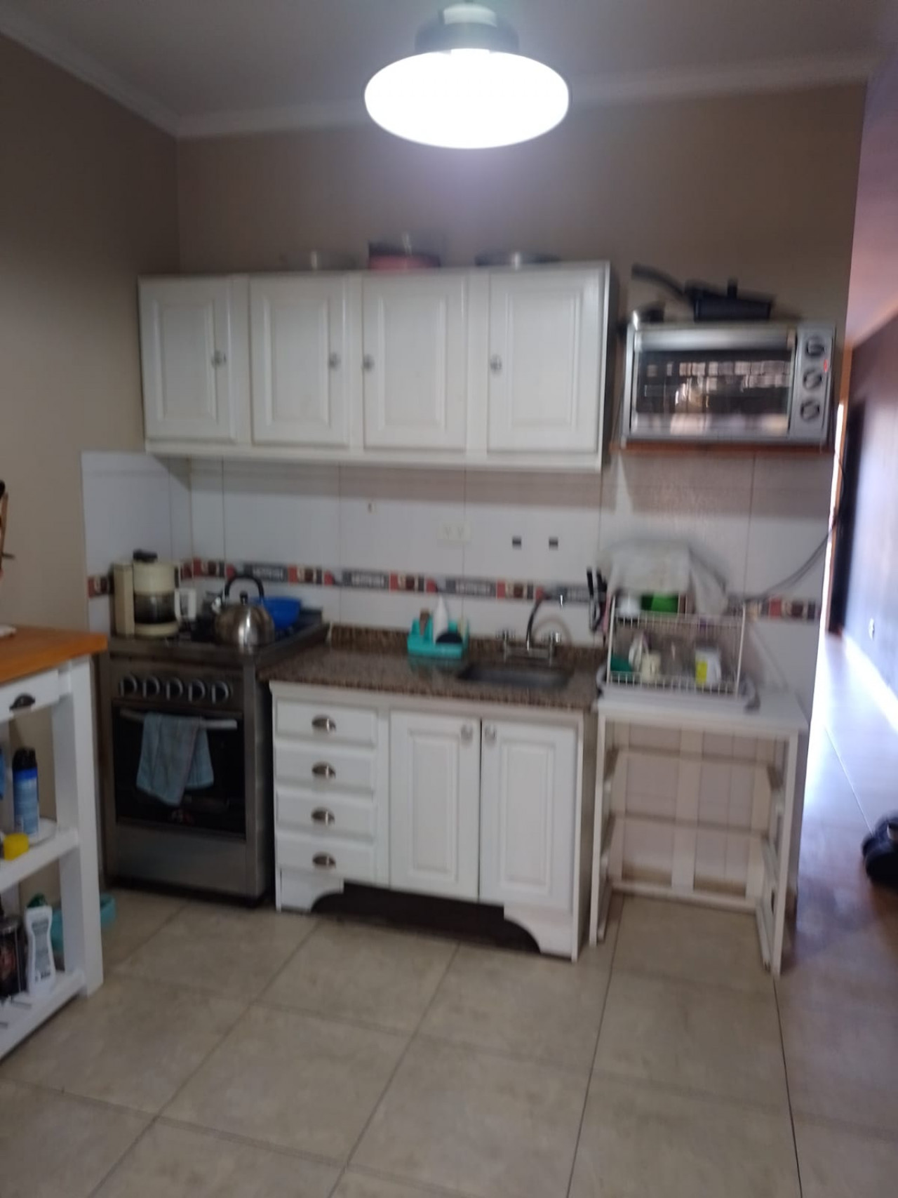 Cocina comedor con mesada, alacena y bajo mesada, con salida al jardín trasero.