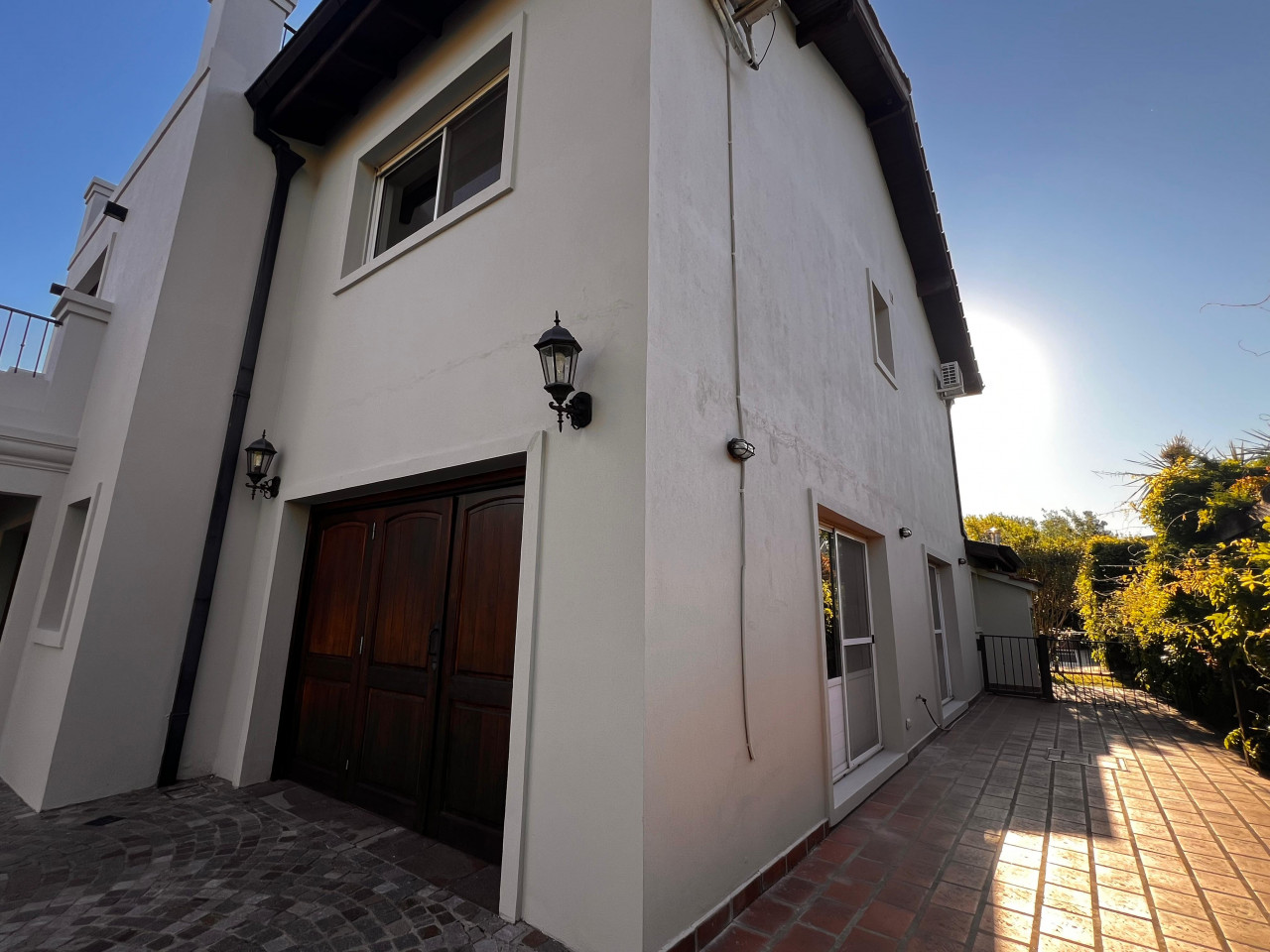 Acceso a galería con parrilla y jardín parquizado.