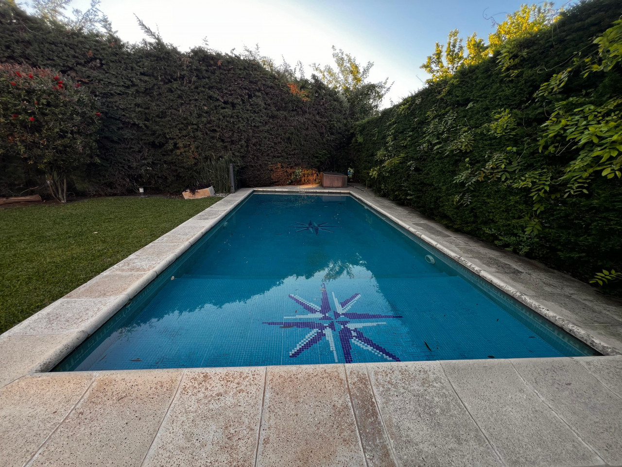 Pileta de 8x4 m con sistema de riego y bomba independiente.