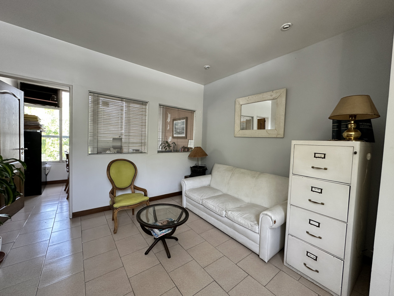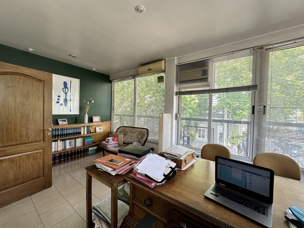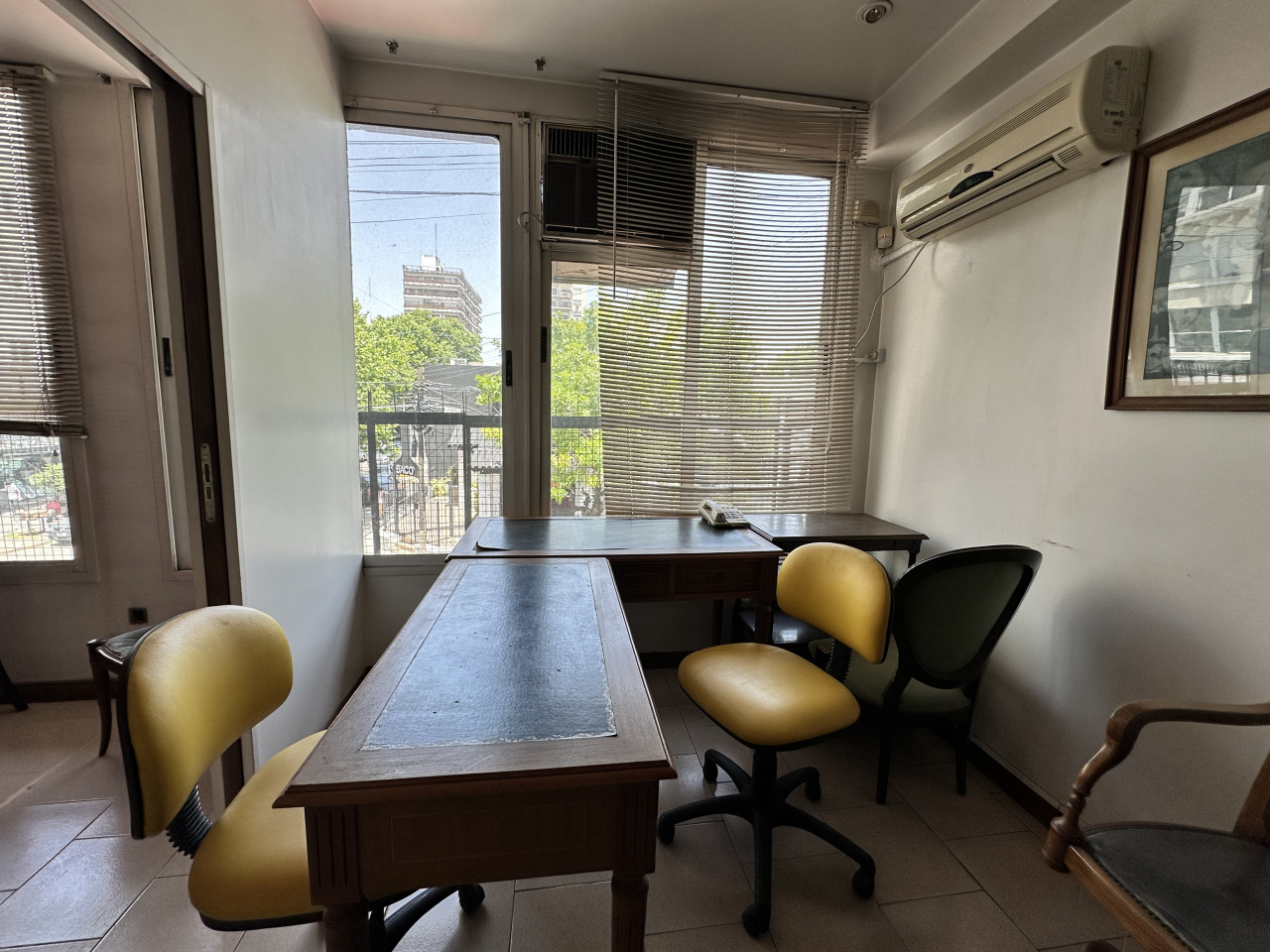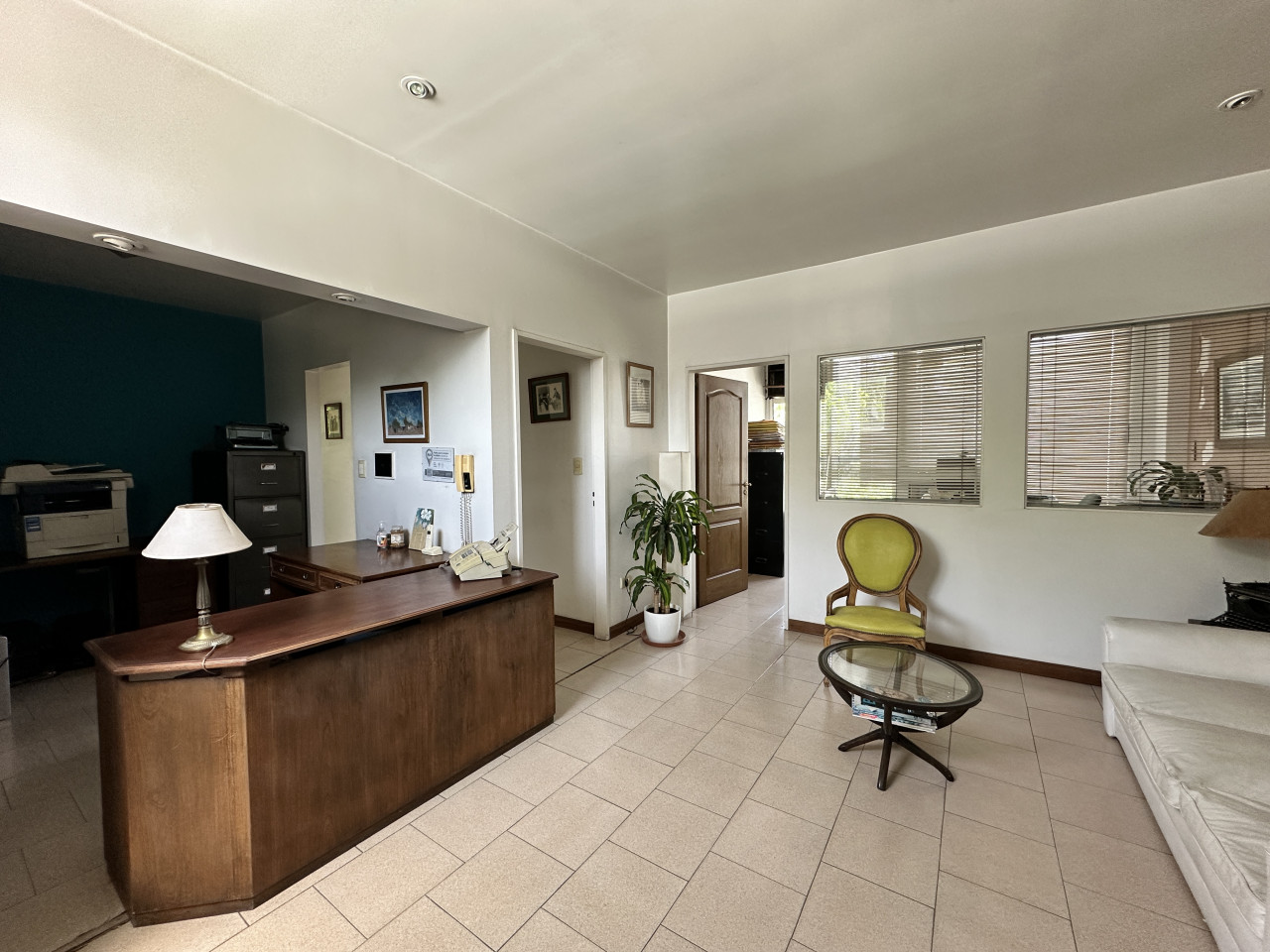 El inmueble está en un primer piso por escalera y cuenta con timbre eléctrico y alarma. Al ingresar, hay un amplio ambiente ideal para recepción y sala de espera, donde también se encuentra la primera oficina con aire acondicionado, ventanas y vidrieras.