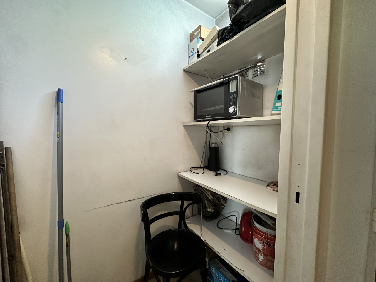 Desde una puerta que da al pasillo se accede al resto de las oficinas: dos de ellas comunicadas entre sí (con opción de cerrarlas), con aire acondicionado y luces regulables. Más adelante, a la izquierda, hay un espacio de guardado, un kitchenet, un antebaño con lavamanos y una canilla baja, y finalmente el toilette. Al final del pasillo se ubica la oficina principal, rodeada por ventanales que aportan luz natural todo el día.